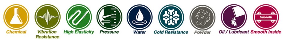 - เสริมโครงสร้างด้วยลวดสปริงชุบทองแดงที่มีขนาดใหญ่กว่าท่อโพลียูรีเทนทั่วไป ทำให้ท่อแข็งแรงและคืนรูปได้ดี